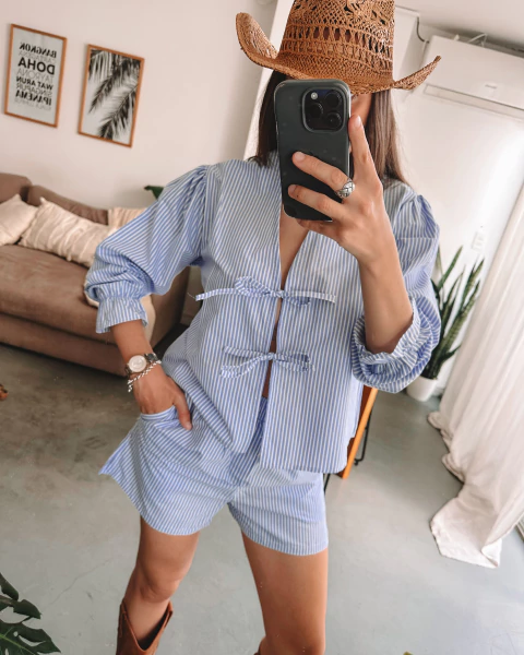 Short celeste rayado con blanco de tela poplin con elástico en la cintura y bolsillos. Se puede combinar con la blusa y la camisa Sicilia.